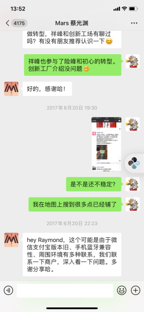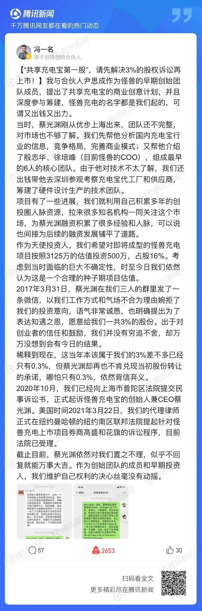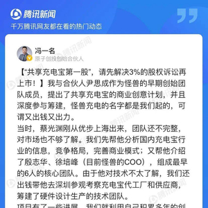16. 在2017年3月31日获得蔡光渊的3%赠与后冯一名和尹思成仍在持续帮助怪兽充电发展。2017年6月20日,冯一名帮助公司反馈产品的Bug,和蔡光渊关于这个产品体验的问题进行讨论。