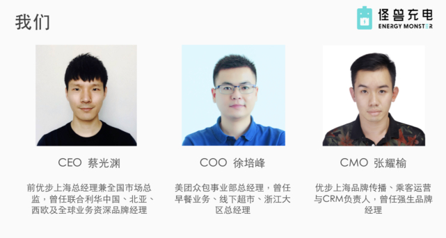 殷志华时任美团智能餐厅事业部总经理,徐培峰时任美团众包事业部总经理,蔡光渊曾任Uber上海总经理。在后来成立的怪兽充电项目中,蔡光渊担任创始人、CEO,徐培峰担任联合创始人、COO,而殷志华则在背后以资源支持该项目。