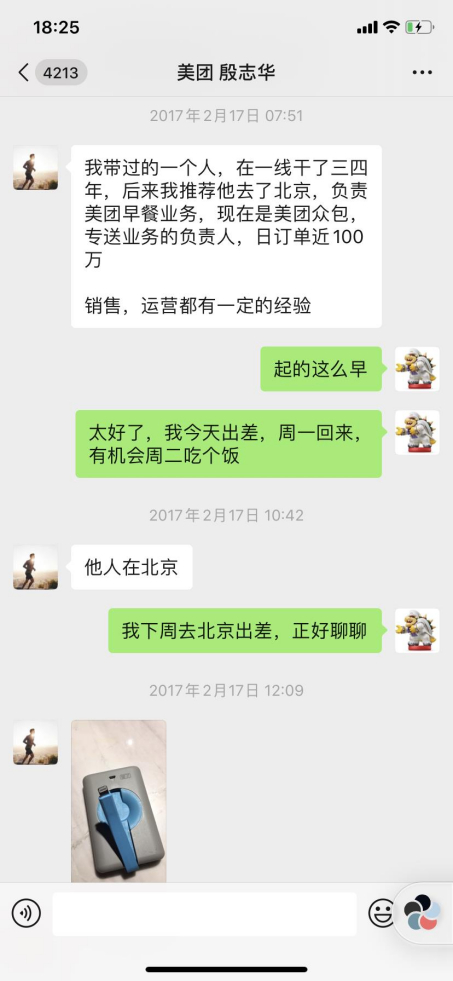 2. 2017年2月15日冯一名找到在美团的殷志华,希望能够合作共享充电宝项目。经过数轮的沟通,殷志华认为他不适合作为新项目的CEO,他可以推荐他的一个手下徐培峰作为公司的CEO。殷志华作为顾问参与这个项目。