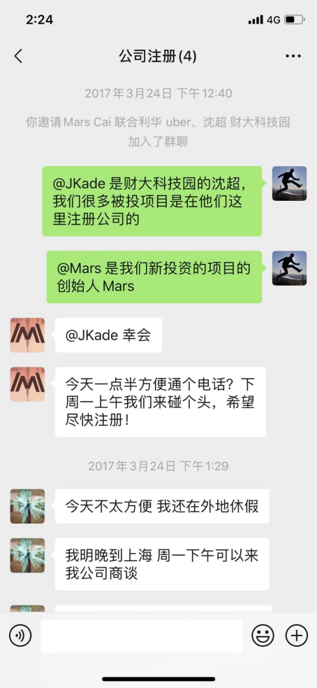 冯一名表示,最早他和同事找团队来做这个项目,就是想原子创投投资,原本在2017年3月中旬已经与蔡光渊等人商量好,投资500万元占股15%,当时蔡光渊也同意了这一价格,之所以没有立即签下书面协议是因为他们想在这家公司注册时就直接成为股东写入工商资料。但是在冯一名带领下见了很多其他机构之后,蔡光渊又反悔了。