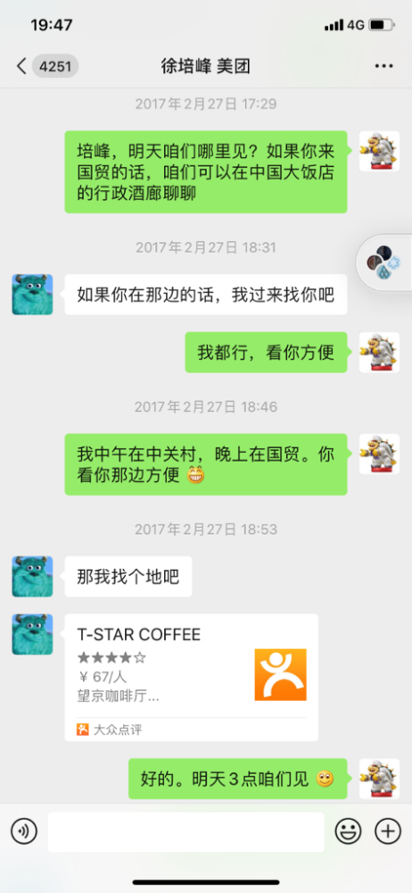 5. 2017年2月26日Winston卯某某代表冯一名去苏州见徐培峰。此时徐培峰比较犹豫是否要出来创业。