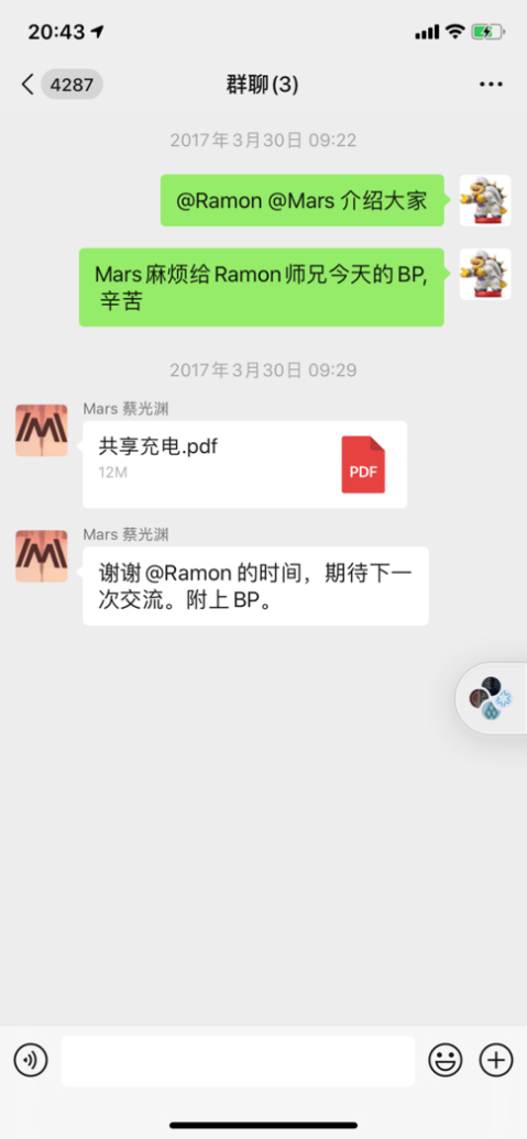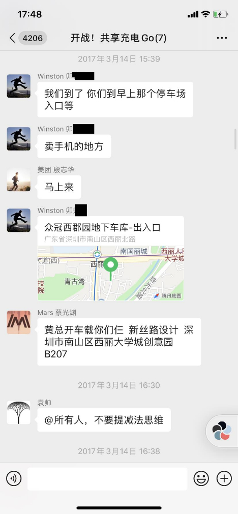 4. 2017年2月20日正式成立“开战!共享充电项目Go”微信群,初始成员冯一名、尹思成(袁帅)、Winston卯某某、殷志华、徐培峰。群聊:
