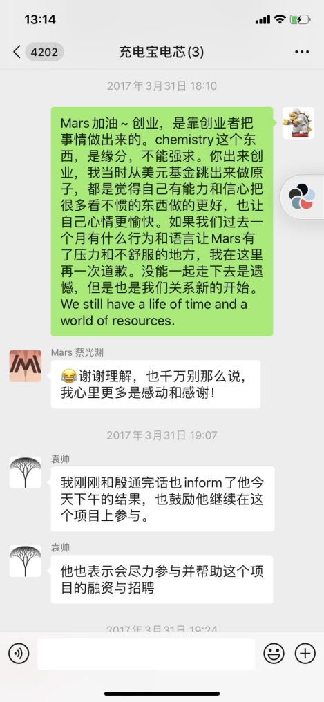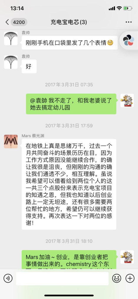 2017年3月31日,蔡光渊以“工作方式”不同为由,说服冯和尹退出项目团队,同时拒绝了此前商量好的入股。双方口头协商,达成对冯一名和尹思成赠予充电宝项目公司3%股权的协议,以此表示感谢。
