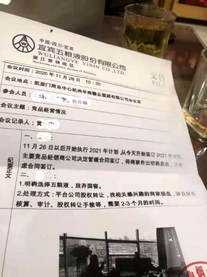 该会议纪要显示,“11月26日以后开始执行2021年计划,从今天开始签订2021年合同,主要竞品经销商公司决定暂缓合同签订,待商家作出明确表态,才考虑合同签订”。另一名参会人员表示:“明确选择五粮液,放弃国窖”,处理方式是“平台公司股权转让,找相关感兴趣的商家接盘,涉及财务核算、审计、股权转让手续等,需要2-3个月时间”。