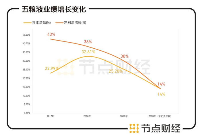 据此前发布的公告显示,2020年五粮液总营收在572亿元左右,同比增幅14%左右;归母净利润199亿元左右,增幅也在14%左右。而在过去三年,公司净利润增幅都在30%以上,营收增幅也在20%以上,增速明显放缓。反观五粮液高端酒领域主要竞对之一的“同省兄弟”泸州老窖,其2020年净利润则预增20%-30%。
