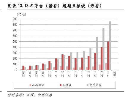2011年和2013年,茅台分别在销售利润和营收上实现了对五粮液的超越,正式问鼎白酒老大之位,并逐渐拉开了与五粮液的差距。