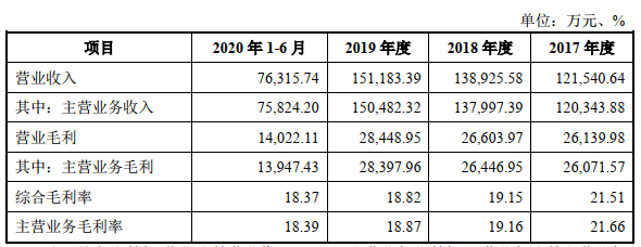 2016年至2020年1-6月,同力日升主营业务毛利率分别为24.20%、21.66%、19.16%、18.87%、18.39%。公司主营业务毛利率逐年下滑,连降3年半。