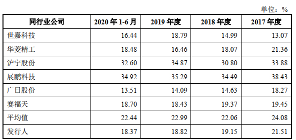 2016年至2020年1-6月,同力日升综合毛利率分别为23.79%、21.51%、19.15%,18.82%、18.37%,同期同行业公司平均值分别为28.98%、24.08%、22.06%、22.99%、22.44%。公司4年1期综合毛利率均低于同期同行业公司平均值。
