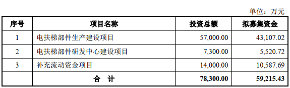 同力日升最终募资净额与原计划持平。同力日升3月9日披露的招股书显示,公司拟募集资金5.92亿元,其中4.31亿元用于电扶梯部件生产建设项目,5520.72万元用于电扶梯部件研发中心建设项目,1.06亿元用于补充流动资金项目。