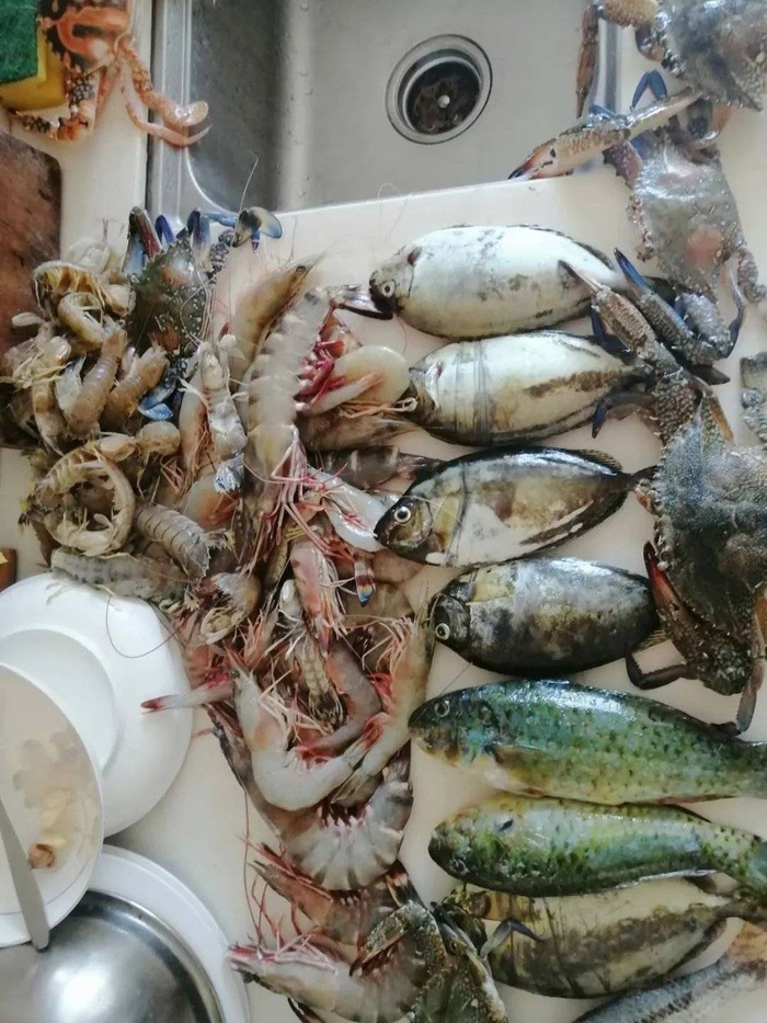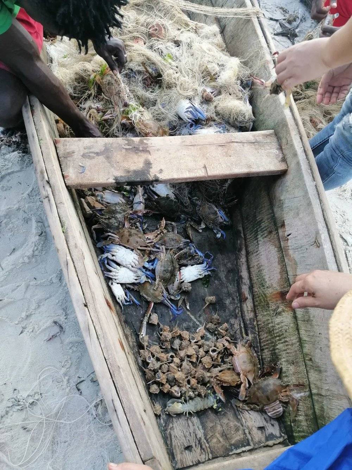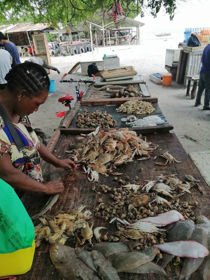 每天的早上八九点中,是渔民回港的时候,十几条人力独木舟会在这时陆陆续续的收网回家,带回来各种各样的海产品,螃蟹、龙虾、各种鱼、对虾、皮皮虾、海螺等等等等,当然很久以前他们只抓鱼和虾,其他附带产品都丢回大海,直到中国人来以后,他们才发现他们弃之如敝履的东西是中国人的宝藏,于是很多东西才有了价格。