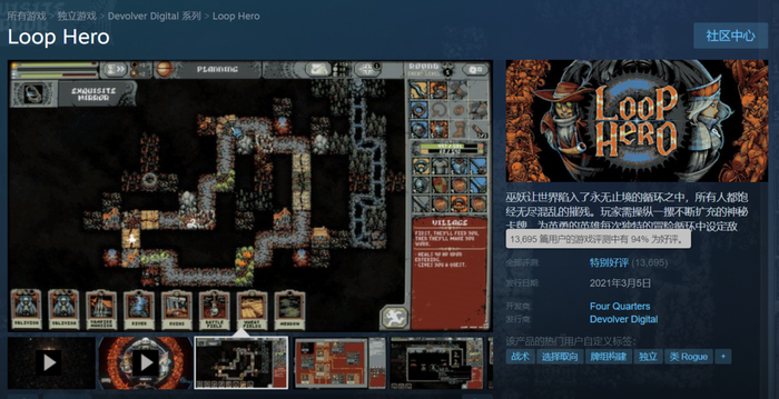 作为一款玩法另类的像素风独立游戏,《循环勇者》(Loop Hero)可能是今年开年最意外的黑马之一,游戏首周的销量就超过了50万份,Steam好评率为94%(刚发售时达到了95%)。不过鲜为人知的是,《循环勇者》的诞生还有一些曲折的经历,游戏首个版本出现在2019年的Ludum Dare游戏开发者大赛上,当时参赛的《循环勇者》是一个完全无法正常运行的游戏。