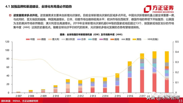逆变器需求多点开花。逆变器需求主要来自新增光伏装机,目前全球新增光伏装机区域多点开花。中国光伏新增装机量占据全球重要一席, 与此同时,亚太地区的越南、韩国高速增长,日本、印度市场也维持较高水平;欧洲市场在西班牙、德国市场的带领下开始复苏;以美国 为主的美洲市场依然稳固;澳大利亚也高速增长。2019年全球新增光伏装机超GW级的国家或地区超过13个,按国家或地区划分的市场 集中度(HHI)达到历史最低点。随着全球光伏平价时代的到来,光伏装机多极化发展的态势有望继续保持。