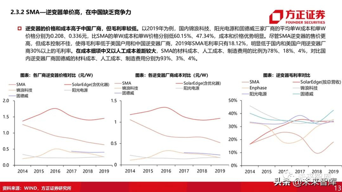 逆变器的价格和成本高于中国厂商,但毛利率较低。以2019年为例,国内锦浪科技、阳光电源和固德威三家厂商的平均单W成本和单W价格分别为0.208、0.336元,比SMA的单W成本和单W价格分别低60.15%、47.34%,成本和价格优势明显。尽管SMA逆变器的售价更 高,但成本控制不佳,使得毛利率低于美国户用和中国逆变器厂商,2019年SMA毛利率只有18.12%,明显低于国内和美国户用逆变器厂 商30%以上的毛利率。在成本细项中又以人工成本差距较大,SMA的材料成本、人工成本、制造费用的比例为78%、18%、4%,对比国 内逆变器厂商固德威的材料成本、人工成本、制造费用分别为93%、3%、4%。