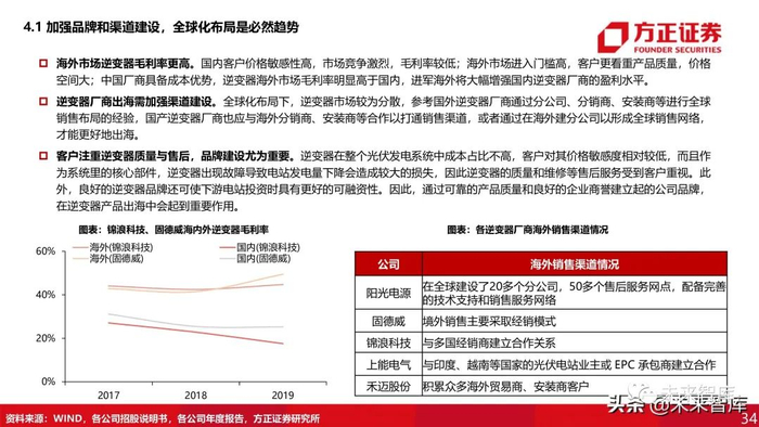 客户注重逆变器质量与售后,品牌建设尤为重要。逆变器在整个光伏发电系统中成本占比不高,客户对其价格敏感度相对较低,而且作为系统里的核心部件,逆变器出现故障导致电站发电量下降会造成较大的损失,因此逆变器的质量和维修等售后服务受到客户重视。此外,良好的逆变器品牌还可使下游电站投资时具有更好的可融资性。因此,通过可靠的产品质量和良好的企业商誉建立起的公司品牌, 在逆变器产品出海中会起到重要作用。