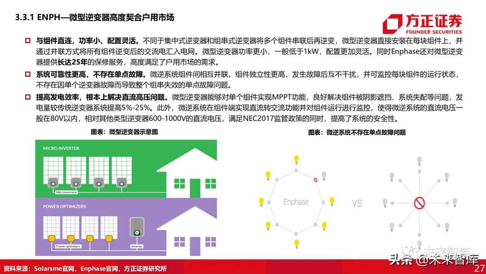 与组件直连,功率小、配置灵活。不同于集中式逆变器和组串式逆变器将多个组件串联后再逆变,微型逆变器直接安装在每块组件上,并 通过并联方式将所有组件逆变后的交流电汇入电网。微型逆变器功率更小,一般低于1kW,配置更加灵活。同时Enphase还对微型逆变器提供长达25年的保修服务,高度满足了户用市场的需求。