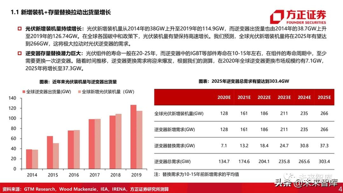 逆变器存量替换潜力巨大:光伏组件的寿命一般在20-25年,而逆变器中的IGBT等部件寿命在10-15年左右,在组件的寿命周期中,至少 需要更换一次逆变器。随着时间推移,逆变器更换需求将迎来爆发,根据我们的测算,在2020年全球逆变器更换市场规模约有7.1GW, 2025年将增长至37.3GW。