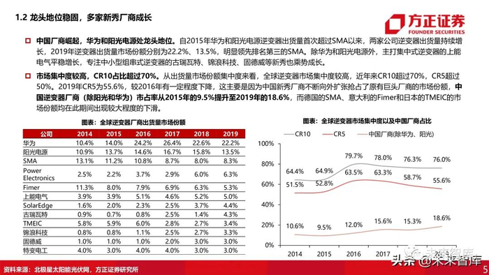 市场集中度较高,CR10占比超过70%。从出货量市场份额集中度来看,全球逆变器市场集中度较高,近年来CR10超过70%,CR5超过 50%。2019年CR5为55.6%,较2016年有一定程度下降,这主要是因为中国新秀厂商不断向外扩张抢占了原有巨头厂商的市场份额,中国逆变器厂商(除阳光和华为)市占率从2015年的9.5%提升至2019年的18.6%,而德国的SMA、意大利的Fimer和日本的TMEIC的市 场份额均在此期间出现较大程度的下滑。