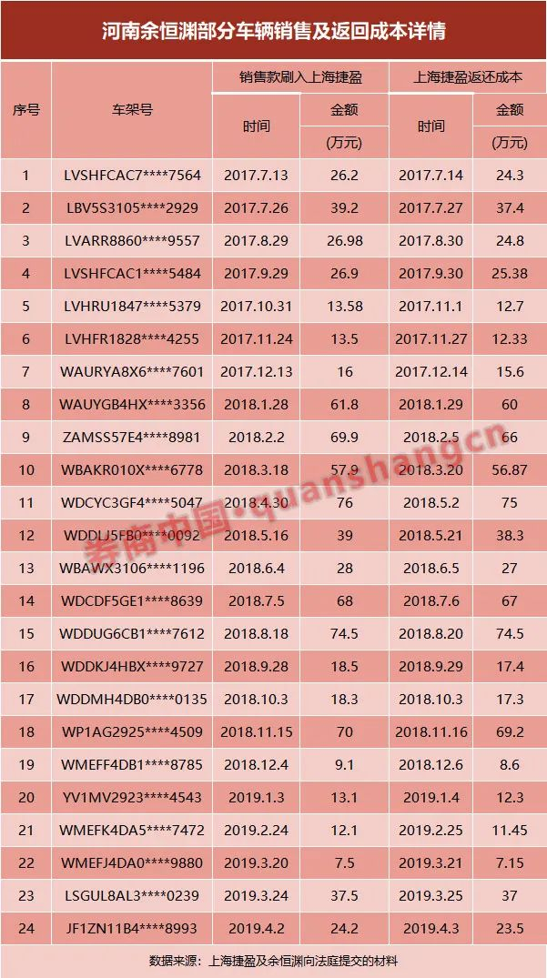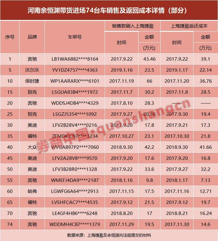 而由上海捷盈出具的材料显示,双方自2017年7月至2019年4月合作期间,其账户共计收到656台车的车款。证券时报·券商中国记者随机每月抽取了一台车的资金流水轨迹,皆符合上海捷盈先收取车款,再向余恒渊个人账户返还成本的特征。