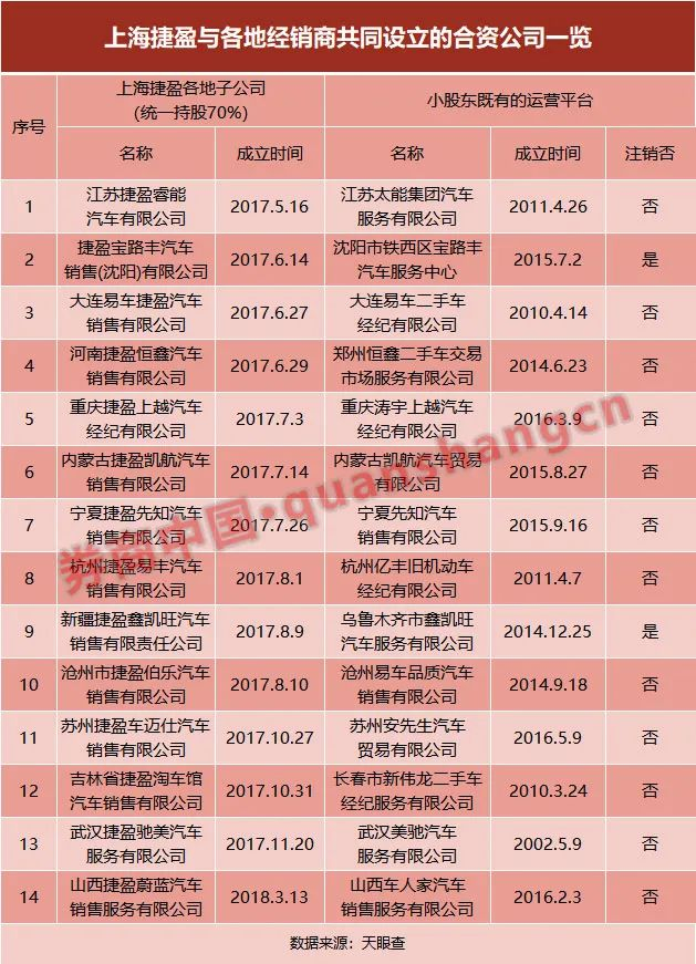根据上海捷盈与各地经销商签署的股权收购协议,新的合资公司成立之后,小股东须将原公司注销,并将相关人员、业务、资产全部转移至新的合资公司。但实际上,除了沈阳等个别的合作方将原公司注销了,其他绝大部分合作方都未注销原公司,而是继续保持经营,仅仅是将部分人员挂在了新合资公司。
