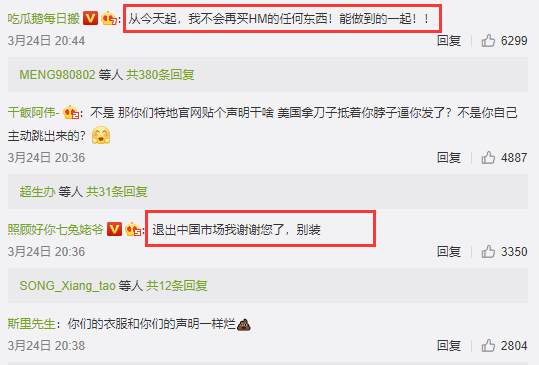 不少网友批评这份声明“看不懂”“避重就轻”。还有网友看完声明后,直接喊话H&M,让其“退出中国市场”。另有网友称,“从今天起,我不会再买HM的任何东西!能做到的一起!”