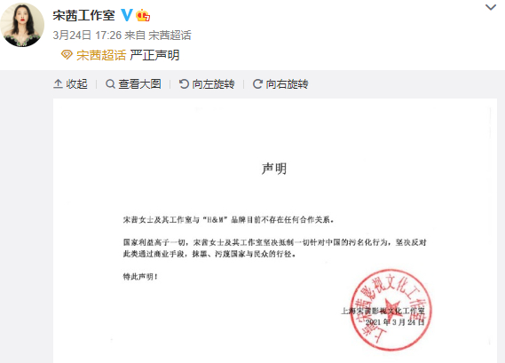 3月24日17时26分,宋茜工作室发表声明称,宋茜女士及其工作室与“H&M”品牌目前不存在任何合作关系,国家利益高于一切。声明还称,“宋茜女士及其工作室坚决抵制一切针对中国的污名化行为,坚决反对此类通过商业手段,抹黑、污蔑国家与民众的行径。