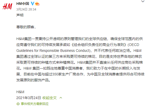 针对上述事件,3月24日晚间,H&M作出了回应,但这份声明并未直接提及新疆,也未就抹黑新疆言论道歉。