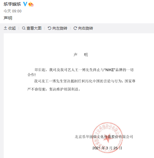 对此,3月25日上午9点,乐华娱乐发布声明称:即日起,公司及公司艺人王一博终止与"NIKE"品牌的一切合作!公司及王一博坚决抵制任何污化中国的言论与行为。国家尊严不容侵犯,坚决维护祖国利益。随后,谭松韵工作室也发布声明,即日起谭松韵终止与NIKE品牌的一切合作。