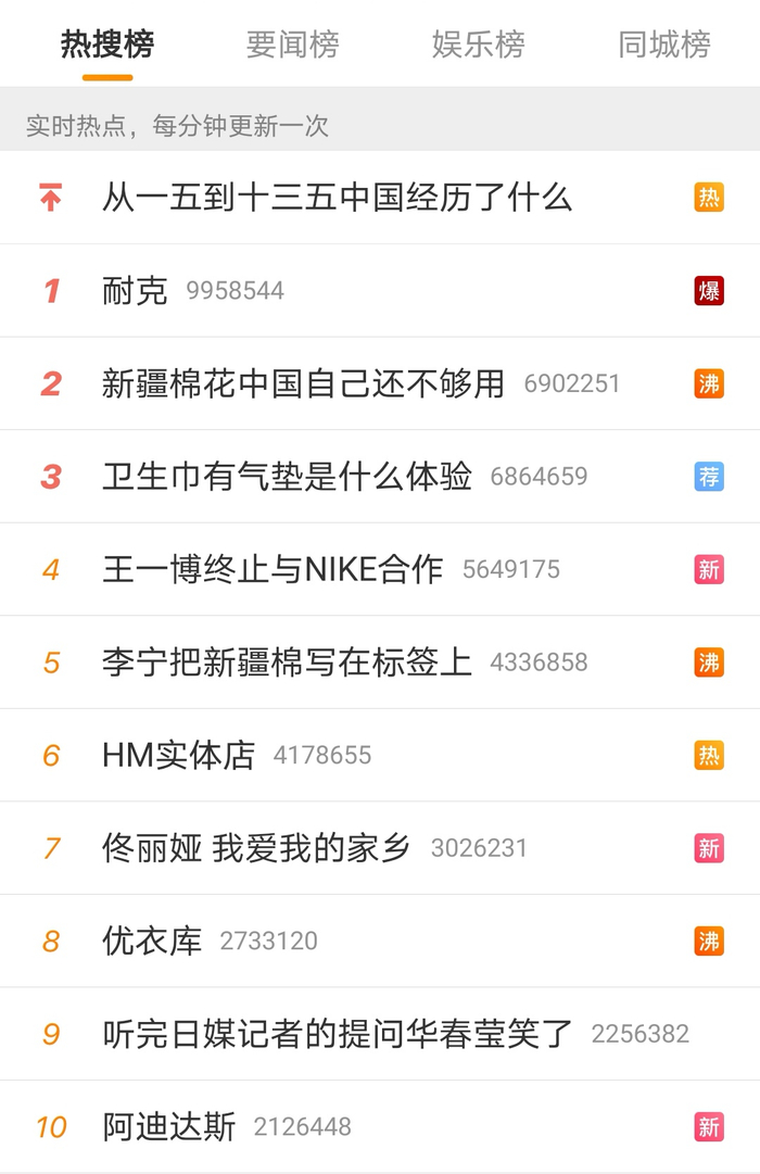 事件进一步发酵,今日上午微博热搜榜前10名单中,H&M、耐克、优衣库、阿迪达斯等与新疆棉花相关的话题占据七成。