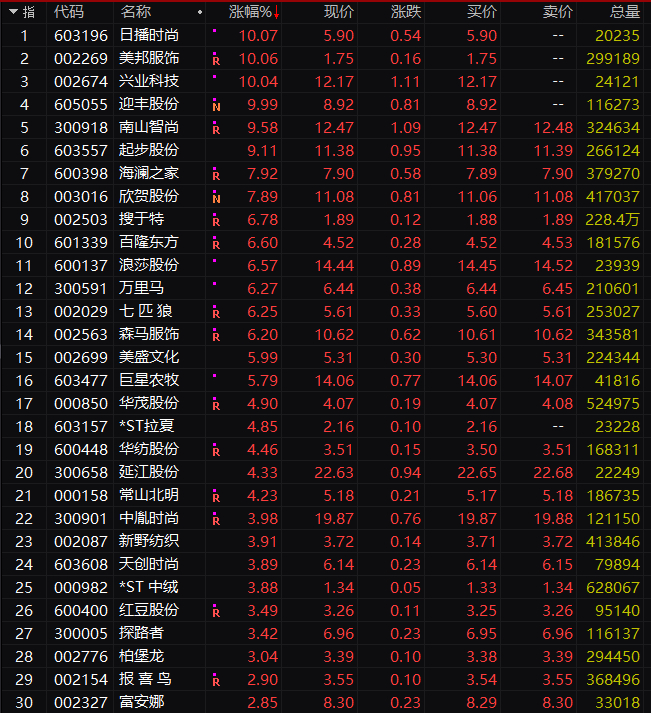 A股市场方面,纺织概念股纷纷崛起,日播时尚、美邦服饰、兴业科技、迎丰股份涨停,南山智尚、起步股份涨逾9%,海澜之家、欣贺股份涨逾7%,百隆股份、浪莎股份、万里马、七匹狼、森马服饰等涨逾6%。