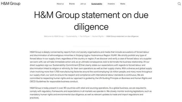 H&M在声明中写道:H&M不与位于新疆的任何服装制造工厂合作,也不从该地区采购产品/原材料。