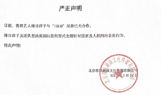 北京春风画面文化传媒有限公司:目前,公司艺人辣目洋子与“H&M”品牌已无合作。辣目洋子及团队坚决抵制以任何形式企图针对国家及人权的污名化行为。