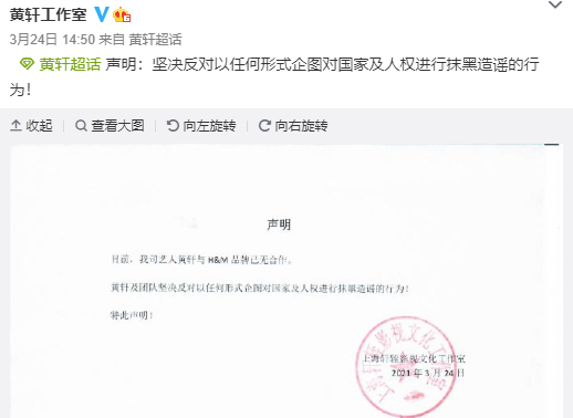 3月24日14时50分,黄轩工作室发文称,公司艺人黄轩与H&M品牌已无合作。黄轩及团队坚决反对以任何形式企图对国家及人权进行抹黑造谣的行为。