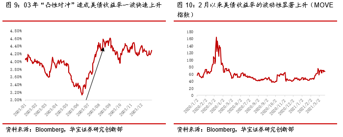 MBS市场上目前仍有超过7成以上的投资者需要进行久期管理。在上述背景下,当美债利率从历史性低位快速上行时,MBS市场“负凸性”更加显著,其组合久期的上升幅度扩大。此时非常容易引发MBS“convexity selling”,这进一步推升了美债收益率的上行和波动的加剧。即便如此,根据历史经验和研究文献,“convexity selling”造成美债收益率上行的持续时间较为短暂,并且引发系统性风险的概率非常低,且不构成美债收益率方向变化的主导力量。
