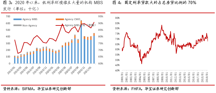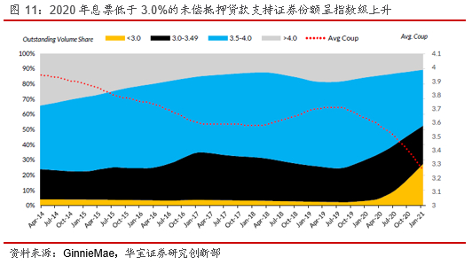 MBS的负凸性特征实际上是本轮美债利率快速上升的推动因素之一。2020年在财政部和美联储大规模政策刺激下,30年抵押贷款利率处于历史最低水平,且美国房价飙升至历史高位,共同促成机构MBS的天量发行以及MBS未偿贷款池利率的大幅下降。2019年,机构MBS共发行约2万亿,平均每月发行1660亿左右;2020年,机构MBS发行大约4万亿,平均每月发行3320亿,20年MBS的发行量几乎是19年的2倍。从MBS底层未偿贷款池利率来看,以吉利美为例,由于利率骤降,2020年息票低于3.0%的未偿贷款池份额呈指数级增长。
