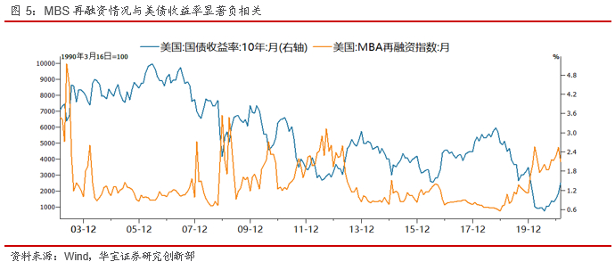 MBS再融资与美债收益率显著负相关。本轮当美债收益率由历史底部上行到一定程度后,MBS提前偿还概率开始逐步下降,MBS再融资指数随之下降。