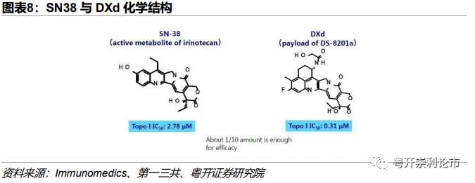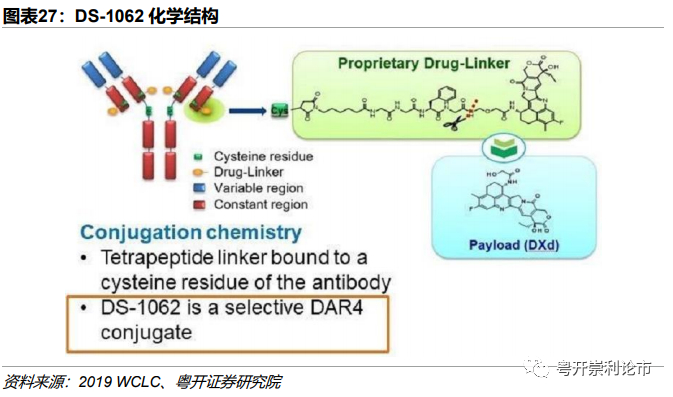 技术:1)DXd为一种创新DNA拓扑异构酶Ⅰ抑制剂,活性为伊立替康(SN-38)的十倍,可干扰DNA复制、重组和基因表达。与微管蛋白抑制剂相比,DXd为更有效和更有潜力的化疗药物;2)半胱氨酸的偶联方式较赖氨酸异质性更小,附着部位更容易预测;3)可剪切linker,发挥旁观者效应。