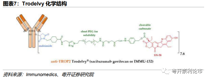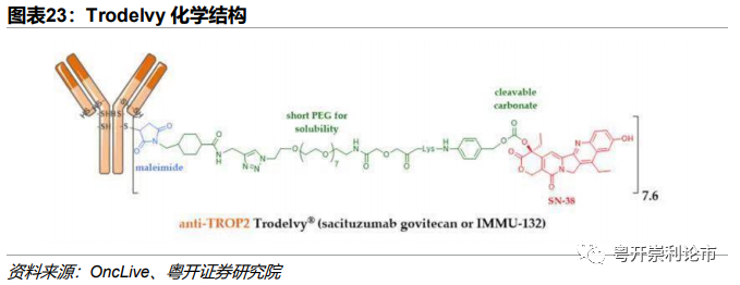 SacituzumabGovitecan商品名为Trodelvy,由Immunomedics(已于2020年9月被吉利德以210亿美元收购)研发,是目前全球唯一一款获批上市的靶向Trop2的ADC药物,适应症为三阴乳腺癌(TNBC)。Trodelvy由3个组分构成:(1)靶向Trop2的人源单抗Sacituzumab;(2)马来酰亚胺连接体;(3)拓扑异构酶Ⅰ抑制剂SN-38(伊立替康的活性代谢物),DAR=7.4。