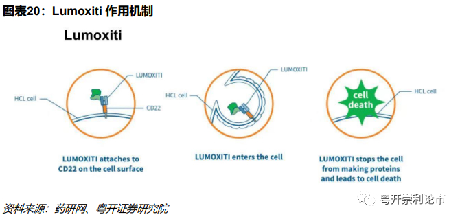 作用机制:Lumoxiti与B细胞CD22靶点结合后,药物内吞,细胞毒素PE38可抑制蛋白质的合成,诱导靶细胞凋亡。