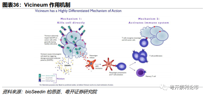 作用机制:Vicineum具有双重作用机制,一方面,Vicineum内化入EpCAM高表达的肿瘤细胞后,释放免疫毒素杀死靶细胞;另一方面,Vicineum可激活免疫系统,T细胞识别肿瘤新生抗原,杀灭靶细胞。