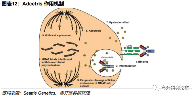 作用机制:当Adcetris与肿瘤细胞膜CD30受体结合后,Adcetris主要通过网格蛋白介导的内吞作用内化进入溶酶体,随后二肽被蛋白酶水解断裂,最终MMAE与细胞质的微管蛋白结合从而阻滞细胞周期的G2/M期,使细胞死亡。由于采用了可裂解的Linker,MMAE可透过细胞膜作用于周围细胞,对CD30非阳性肿瘤细胞产生细胞毒效应。