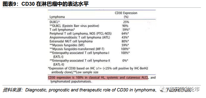 CD30是肿瘤坏死因子(TNF)受体超家族成员之一。健康个体中,CD30低表达于正常激活的T细胞和B细胞表面,在正常细胞中不表达。在霍奇金淋巴瘤和和间变大细胞淋巴瘤表面,CD30常处于高表达。此外,研发发现CD30与细胞的增殖和死亡密切相关,特别是其胞内结构部分可与TNFR相关因子家族的多个成员相互作用,不仅能够通过JNK和p38途径诱导细胞凋亡,还可以依赖NF-κB途径介导细胞活化。