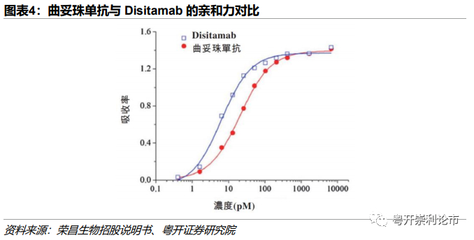 对于HER2 ADC药物,绝大多数ADC药物均使用曲妥珠单抗,荣昌生物另辟蹊径,在RC48中采用Disitamab新型抗体。Disitamab的亲和力显著高于曲妥珠单抗,与曲妥珠单抗20.1pM的EC50相比,Disitamab的EC50仅6.4pM。凭借更强的亲和力,RC48在HER2低表达的乳腺癌和胃癌上表现同样优异。