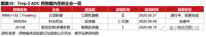 国内共三家企业着手Trop2 ADC的研发,分别是云顶新耀的IMMU-132、科伦药业的SKB264和君实生物/多禧生物的JS108。截至2021年3月16日,云顶新耀的IMMU-132研发居前,已处于临床Ⅱ期;科伦药业的SKB264处于Ⅰ/Ⅱ期;君实生物的JS108处于临床Ⅰ期。