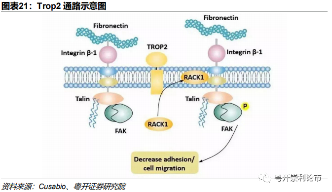Trop2是由TACSTD 2基因编码表达的细胞表面糖蛋白,又名肿瘤相关钙离子信号转导子2(TACSTD2)。研究表明,TROP2在人体健康组织中有不同水平的表达,表达水平最高的是乳腺、肾脏以及胰脏的上皮组织。在肿瘤中,TROP2的表达水平会出现显著升高,包括乳腺癌、肺癌、胃癌、结肠直肠癌、胰腺癌、前列腺癌、宫颈癌等,科学家认为TROP2的高表达在肿瘤细胞的生长过程中起到关键作用,还与更侵袭性的疾病和预后不良相关。