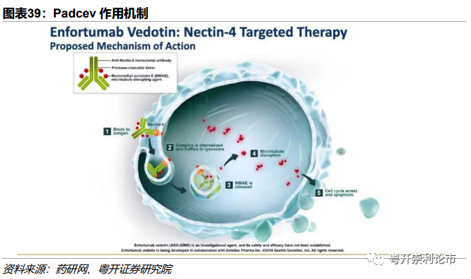 作用机制:Padcev与表达Nectin-4的癌细胞结合后,内化入靶细胞,在溶酶体中降解,释放细胞毒素MMAE,MMAE与微管蛋白结合,导致细胞周期停滞,使细胞凋亡。