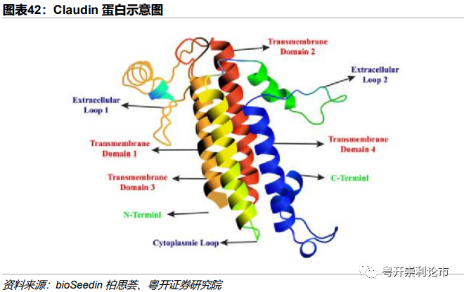 Claudin是人体正常组织中紧密连接最重要的一种蛋白质,具有4个跨膜结构域,是细胞紧密连接的重要分子,参与集体生理过程如细胞旁通透性和电导的调节,其构成了细胞旁屏障。该家族拥有至少24个成员,不同的Claudin蛋白表达于不同的组织,与各自组织肿瘤发生具有相关性,其中Claudin-1与结直肠癌高度相关,Claudin-10与肝细胞癌发生密切,Claudin-18在胃癌上高表达。