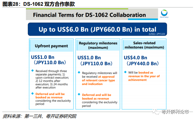 里程碑费用:阿斯利康和第一三共将平摊全球范围内(除日本)与DS-1062相关的开发和商业化费用以及利润,第一三共将承担在日本的费用并向阿斯利康支付个位数的版税。根据协议,阿斯利康将分期向第一三共支付10亿美元的预付款,即协议完成时支付3.5亿美元,从协议生效之日算起,12个月后支付3.25亿美元,24个月后支付3.25亿美元。在该药物成功获批上市时,阿斯利康将额外支付高达10亿美元监管里程碑款项,另外还有高达40亿美元的销售相关里程碑款项,总交易额高达60亿美元。