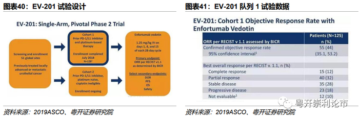 队列1实验设计:Padcev获得FDA的加速获批上市基于单臂、双队列、关键性Ⅱ期临床研究EV-201队列1的结果。队列1入组之前曾接受PD-1/PD-L1抑制剂治疗和含铂化疗的患者,队列2入组之前接受过PD-1/L1抑制剂治疗、未接受铂类化疗且不符合顺铂治疗条件的患者。队列1试验纳入125名既往接受过PD-1/PD-L1抑制剂和含铂化疗方案治疗的局部晚期或转移性尿路上皮癌患者,所有患者在每个28天周期的第1天、第8天和第15天静脉注射1.25mg/kg Padcev。试验的主要终点为客观缓解率(ORR),次要终点包括反应持续时间(DOR)、无进展生存期(PFS)、总体生存期(OS)和安全性/耐受性。