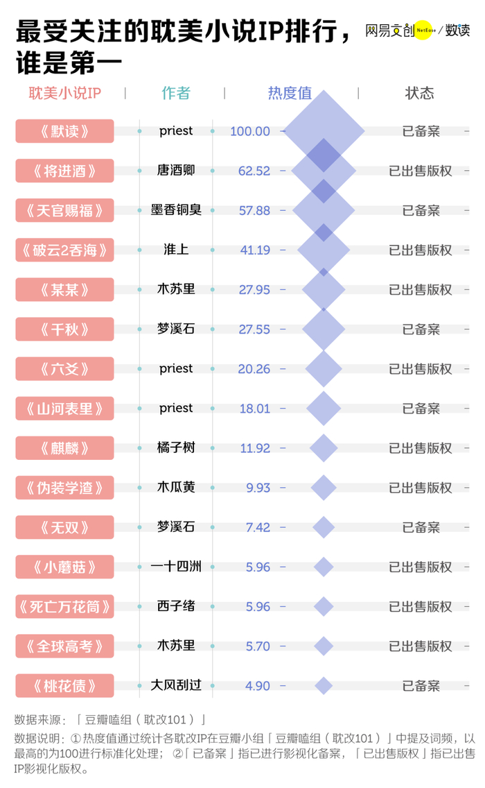 “P 大”是耽美作者中的“顶流”,热度最高的 15 个未开拍耽改 IP 里,priest 的小说就有三部——《默读》《六爻》和《山河表里》。此前大火的《镇魂》和《山河令》的原著作者,也正是 priest。