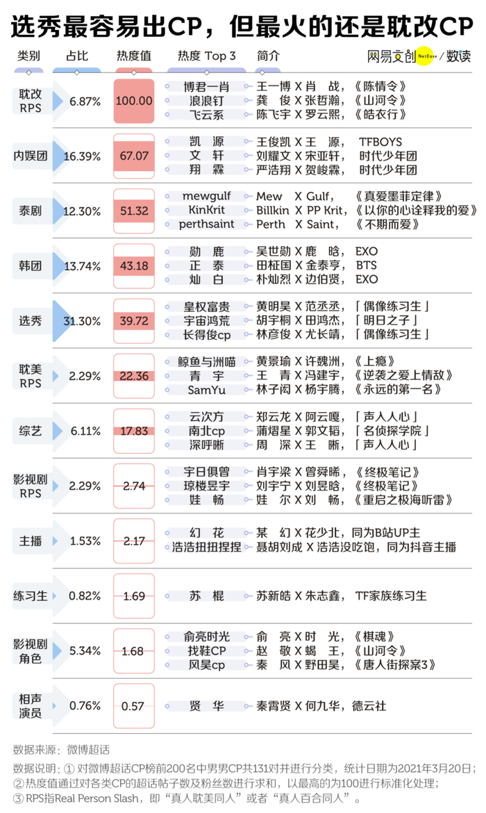 选秀,当代 CP 的制造机。微博超话 CP 榜 131 对中,有 31.3% 来自选秀节目。节目录制过程中,选手互动频繁,也最容易找到糖。